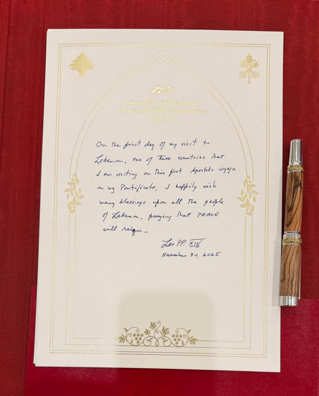 هذا ما دونه البابا في السجل الذهبي في قصر بعبدا: 30/11/2025 “في اليوم الأول من زيارتي إلى لبنان، وهو واحد من بلدين أزورهما في أوّل رحلة رسولية لي منذ بداية حبريّتي، أتوجّه بأطيب التمنّيات والبركات إلى جميع أبناء الشعب اللبناني، مُصلّياً أن يسود السلام”. ShareShareShare Previous Postالبابا لاوون من بعبدا: السلام في لبنان ضرورة ومسؤولية مشتركة Next Postاليوم الأول البابا السلام في أرض القديسين