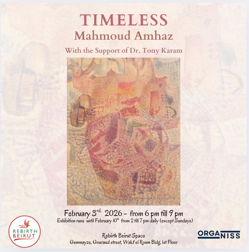 معرض “Timeless” لمحمود أمهز: احتفاء بالفن والذاكرة وبيروتيقدّم معرض “Timeless” أحدث أعمال الفنان اللبناني المخضرم محمود أمهز (مواليد 1935، بعلبك)، في تجربة فنية تحتفي بالزمن بوصفه استمرارية حيّة لا نهاية لها.على امتداد مسيرته الطويلة، تعامل أمهز مع اللوحة كمساحة للتأمل، حيث يلتقي الخط بالضوء والصمت. ورغم انغراس أعماله في التجريد، تبقى مشدودة إلى الواقع، فتتسلل الخبرة المعاشة والذاكرة والحضور الإنساني إلى السطح من خلال الشكل والبناء.وفي عمر 91 عاماً، يبرهن محمود أمهز على حيوية إبداعية استثنائية؛ إذ أنجز خلال أقل من عام مجموعة كاملة من الأعمال الجديدة خصيصاً لمعرض Timeless . ويشكّل هذا الإنجاز شهادة حيّة على التزامه الدائم بالتجدد والاستكشاف الفني. يضم المعرض هذه الأعمال الحديثة إلى جانب لوحات مختارة من مراحل سابقة، في حوار نادر بين الأزمنة داخل التجربة الفنية نفسها.يقام الافتتاح اليوم 3 شباط/فبراير 2026 من الساعة 6:00 مساءً حتى 9:00 مساءً . ويستمر المعرض حتى 10 شباط/ فبراير 2026، ويفتح أبوابه يومياً من الساعة 2:00 بعد الظهر حتى 7:00 مساءً، ما عدا أيام الأحد. ويُقام المعرض في مقر Rebirth Beirut الثقافي، الجميزة، شارع غورو، مبنى وقف الروم، الطابق الأول.تتغذّى ممارسة محمود أمهز الفنية من خلفيته المزدوجة في علم الآثار وتاريخ الفن، حيث يزاوج بين الصرامة البحثية والحدس الإبداعي. تقوم أعماله على أنظمة هندسية تُنعشها الحروفية العربية وقد تحوّلت إلى إيقاع بصري وبناء مكاني. كما تبرز إشارات خافتة إلى المشهد الطبيعي والعمارة والحضور الإنساني، لا بوصفها تمثيلاً مباشراً، بل كذاكرة بنيوية تربط التجريد بالحوار المستمر بين التراث والحداثة.وفي تعليق له على المعرض، قال رئيس ومؤسس الجمعية السيد غابي فرنيني: “جمعيتنا قائمة على قناعة راسخة بأن الفن والثقافة والمجتمع ركائز لا تنفصل في نهضة مدينتنا. استضافة معرض Timeless لمحمود أمهز تتيح لنا الاحتفاء بروح بيروت الصامدة، وتوجيه طاقة الإبداع نحو مشاريع ذات معنى تعود بالنفع على مجتمعنا.”يُقدَّم المعرض من تنظيم Organiss Management، وبدعم من الدكتور طوني كرم، وستخصّص عائدات المعرض لدعم مبادرات Rebirth Beirut المستمرة.يشكّل Timeless فرصة نادرة لاختبار اللغة البصرية المتفرّدة لمحمود أمهز—لغة صاغها عبر عقود، وما زالت تنبض بالحياة اليوم—بالتوازي مع المساهمة في دعم الحراك الثقافي والمدني في بيروت.