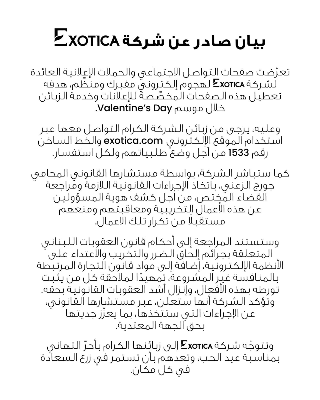 وعليه، يرجى من زبائن الشركة الكرام التواصل معها عبر استخدام الموقع الإلكتروني exotica.com والخط الساخن رقم 1533 من أجل وضع طلبياتهم ولكل استفسار.