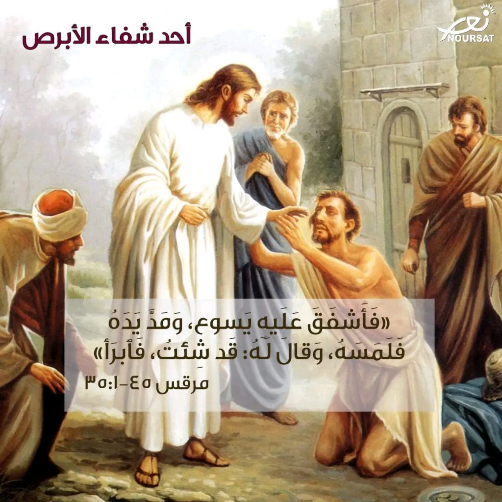 وأتاه أَبْرَصُ يَتَوَسلُ إليه، فَجَثا وقال له: “إن شئتَ فَأَنتَ قادر على أن تُبرِئَني” . فأشفَقَ عليه يسوعُ ومَدَّ يَدَه فَلَمَسَه وقَالَ له : “قد شِئتُ فَابرأ” ، فزالَ عَنهُ البَرَصُ لِوَقِتَه وبَرِئ فَصَرَفَهُ يسوعُ بَعدَ ما أَنذَرَه بِلَهْجَةٍ شَدِيدَة فقال له: “إِيَّاكَ أَن تُخبر أَحَداً بِشَيء، بَلِ اذْهَبْ إِلى الكاهن فَأرِهِ نَفْسَكَ، ثُمَّ قَرِّبْ عن بُرئِكَ ما أَمَرَ بِه موسى، شهادةً لَدَيهم”.