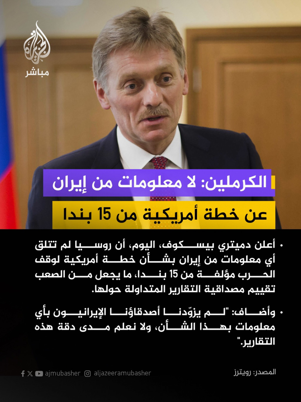 أعلن دميتري بيسكوف، اليوم، أن روسيا لم تتلق أي معلومات من إيران بشأن خطة أمريكية لوقف الحرب مؤلفة من 15 بندا، ما يجعل من الصعب تقييم مصداقية التقارير المتداولة حولها.وأضاف: “لم يزوّدنا أصدقاؤنا الإيرانيون بأي معلومات بهذا الشأن، ولا نعلم مدى دقة هذه التقارير.”