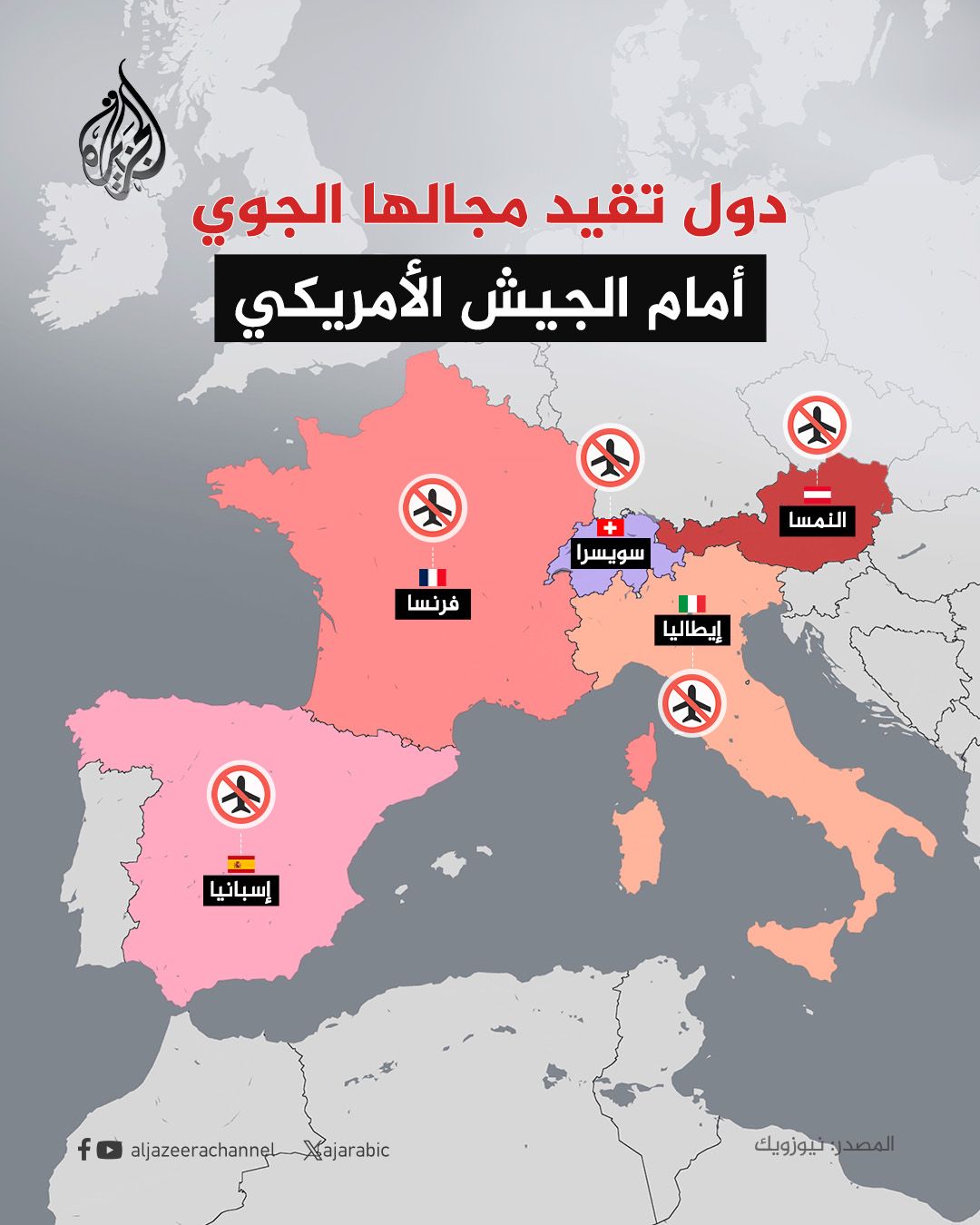 أصبحت النمسا أحدث دولة تغلق مجالها الجوي أمام القوات الأمريكية والإسرائيلية المتجهة إلى إيران، لتنضم إلى ما لا يقل عن أربع دول أخرى في أوروبا.واتخذت كل من إسبانيا وإيطاليا خطوات مشابهة، بتقييد وصول الجيش الأمريكي إلى مجالهما الجوي أو قواعدهما.بدورها رفضت فرنسا السماح لطائرات أمريكية متجهة إلى إسرائيل بالمرور عبر مجالها الجوي، وقال مسؤولون فرنسيون إن باريس لم تفرض إغلاقا شاملا، وإنما تراجع طلبات التحليق العسكري بشكل فردي.كما رفضت سويسرا، استنادا إلى قوانين الحياد الخاصة بها، معظم الطلبات الأمريكية لاستخدام مجالها الجوي خلال حرب إيران.