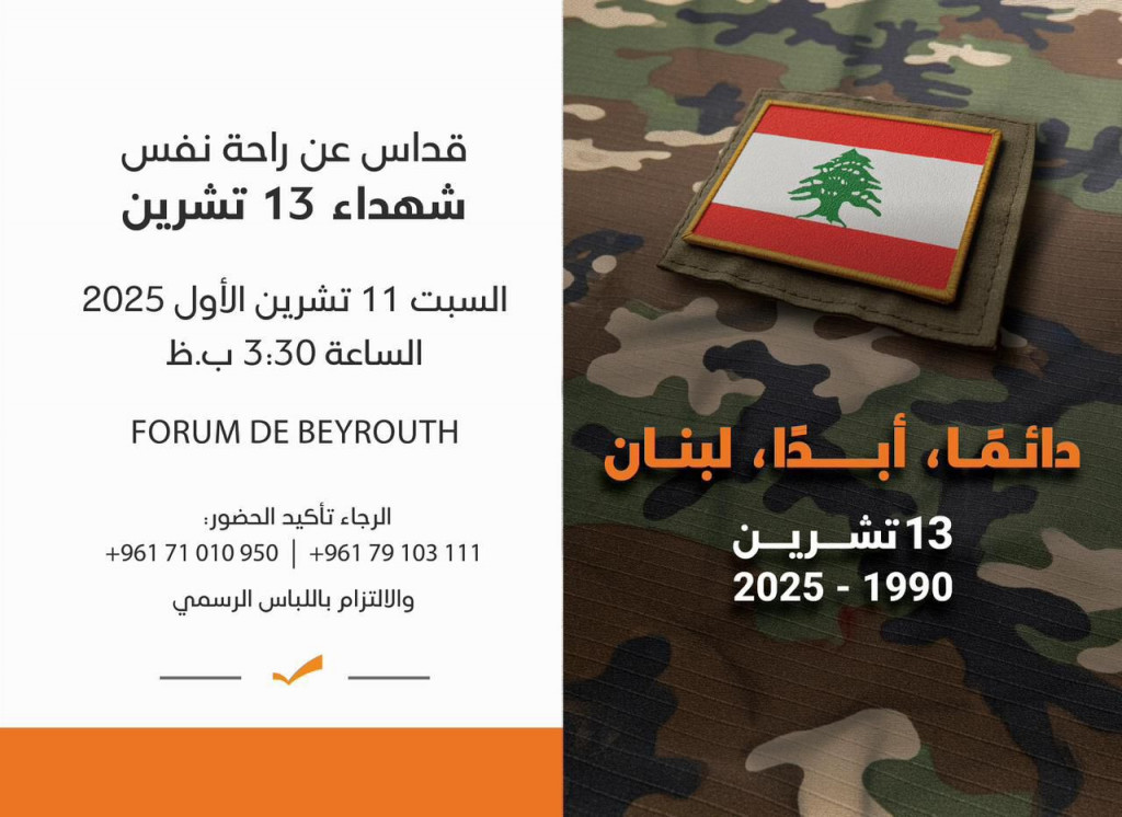لقونا بمكتب هيئة قضاء بيروت بالأشرفية هذا السبت الساعة ١٢:٣٠ ظهراً ، تنرفع سوا الصلاة على نيّة شهداء ١٣ تشرين ، ونتشارك لقمة رحمة قبل ما نتوجّه عالقداس بالفوروم دو بيروت 🇱🇧