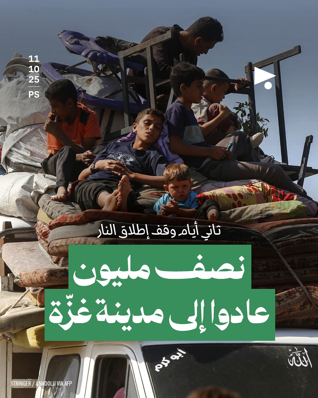 في ثاني أيام وقف إطلاق النار، أعلن الدفاع المدني في قطاع غزّة أنّ أكثر من نصف مليون شخص عادوا إلى مدينة غزّة ومناطق الشمال. وأفادت وزارة الصحة الفلسطينية عن انتشال 116 شهيداً من تحت الأنقاض، مؤكدةً استشهاد 46 شخصاً خلال الساعات الـ24 الأخيرة، لترتفع حصيلة الإبادة إلى 67,682 شهيداً.