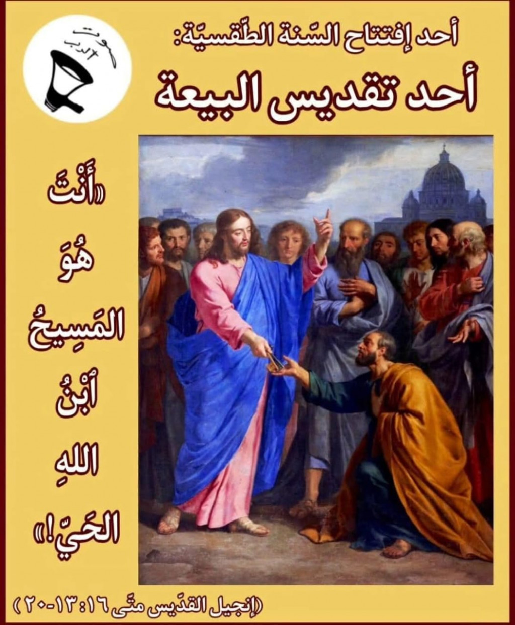 وَلمَّا وصلَ يسوع إلى نواحي قَيصَرِيَّةِ فيلبُّسَ سَأَلَ تَلاميذه: “مَنِ ابْنُ الإِنسان في قولِ النَّاس؟” فقالوا: “بَعْضُهم يقول: يوحَنَّا المعمدان، وبَعضُهُمُ الآخَرُ يقول: هو إيليا، وغيرُهم يقول : هو إِرْمِيا أو أَحَدُ الأنبياء.” فقالَ لَهم: “ومَن أَنا في قَولِكم أنتم؟” فَأَجابَ سمعان بُطرس : “أَنتَ المسيح ابن الله الحَي.” فَأَجابَه يسوع: “طوبى لَكَ يا سِمعان بن يونا، فَلَيسَ اللَّحم والدَّمُ كشفا لك هذا، بل أبي الَّذِي فِي السَّمَوات. وأَنا أَقولُ لكَ : أَنتَ صَخرٌ وعلى الصَّخرِ هذا سَأَبْني كَنيستي، فَلَن يقوى عليها سُلْطانُ الموت، وسأعطيكَ مَفاتيح ملكوت السَّمَوات، فما رَبَطْتَهُ في الأَرضِ رُبِطَ في السَّمَوات، وما حَلَلتَه فى الأَرضِ حُلَّ فى السَّمَوات”. ثُمَّ أَوصى تلاميذه بِألَّا يُخبِروا أَحَداً بِأَنَّهُ المسيح.