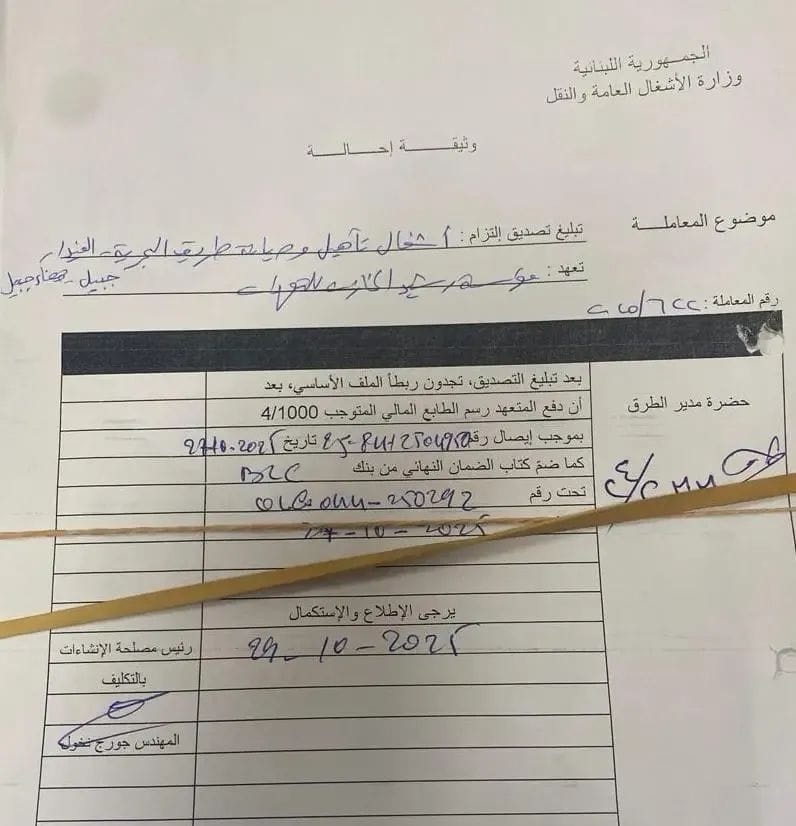 واستكملت جميع معاملات التلزيم عهد الوزير حمية الذي بقي يتابع الموضوع حتى خواتيمه ، كما بقي يوسف باسيل يتابع الموضوع لدى الوزير الحالي فايز رسامني حتى انتهى ( مشكورا ) بتلزيمه لمؤسسة رشيد الخازن للتعهدات بكلفة 406000$، وبعد التواصل مع الشيخ صالح الخازن أكّد بأن التنفيذ سيبدأ بخلال ١٠ ايام