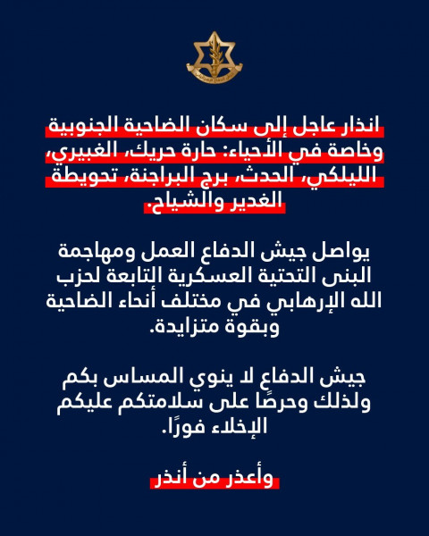 انذار عاجل إلى سكان الضاحية الجنوبية وخاصة أحياء: حارة حريك والغبيري والليلكي والحدث وبرج البراجنة وتحويطة الغدير والشياح
